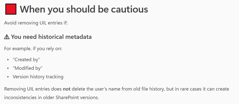 Actually, this article is more about “Is it safe to remove all deleted user accounts from all SharePoint sites UIL?”, as managing user lifecycle changes in Microsoft 365 goes far beyond deciding whether it’s safe to remove a single user from an individual SharePoint UIL. In large Microsoft 365 tenants, deleted or inactive accounts – sometimes called orphaned identities – can create clutter and confusion in permissions and UI elements affecting governance clarity, audit readiness. This KBA explains the broader tenant‑scale implications of cleaning up deleted user accounts across all SharePoint sites.
